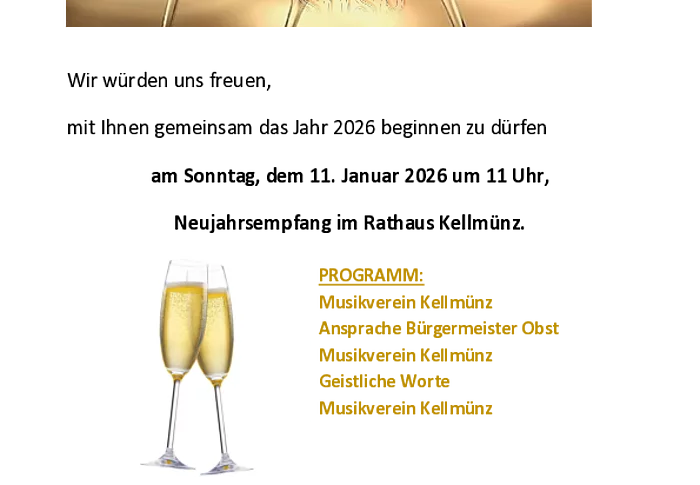 Wir würden uns freuen, mit Ihnen gemeinsam das Jahr 2026 beginnen zu dürfen am Sonntag, dem 11. Januar 2026 um 11 Uhr,Neujahrsempfang im Rathaus Kellmünz. PROGRAMM:Musikverein KellmünzAnsprache Bürgermeister ObstMusikverein KellmünzGeistliche WorteMusikverein Kellmünz Wir wünschen Ihnen alles Gute für das neue Jahr 2026! Markt Kellmünz a. d. Iller Pfarrgemeinde St. Martin Michael Obst             Thomas Kleinle1. Bürgermeister       Pfarrer Wir weisen darauf hin, dass bei der…