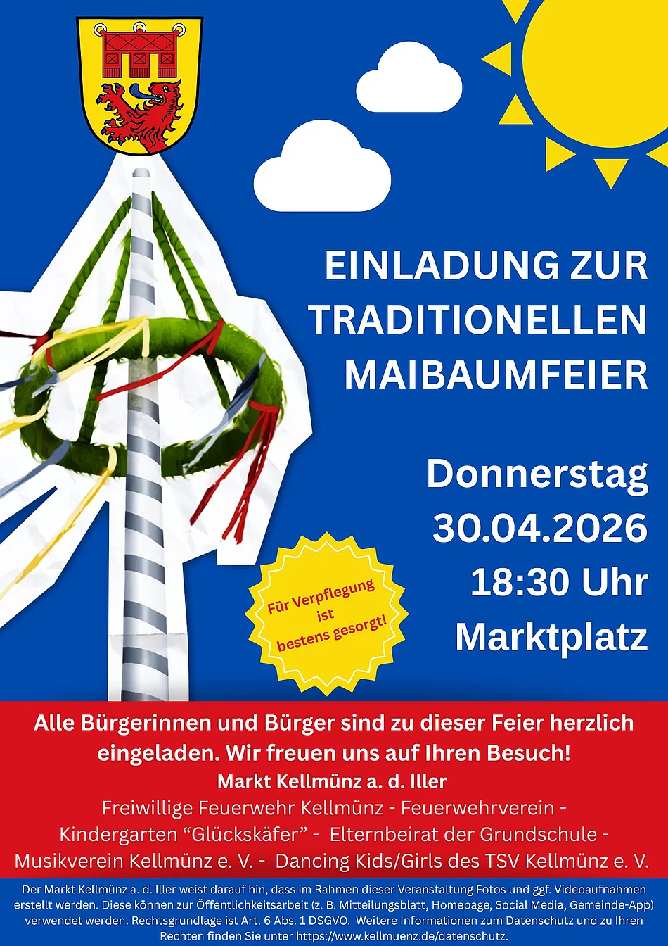 Der Markt Kellmünz a. d. Iller lädt alle Bürgerinnen und Bürger ganz herzlich zur traditionellen Maibaumfeier am Donnerstag, dem 30. April 2026 ab 18:30 Uhr auf dem Marktplatz ein.